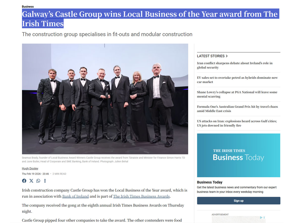 Castle Group is delighted to have been named Local Business of the Year by The Irish Times.
